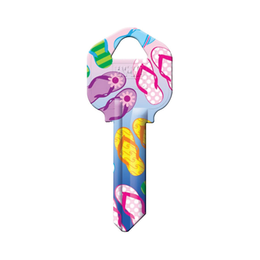 Hy-Ko Key Blank, Design/Theme: Flip Flops, Key Number: KW1, Brass, Nickel-Plated, Suitable for: Kwikset KW1 Keyways