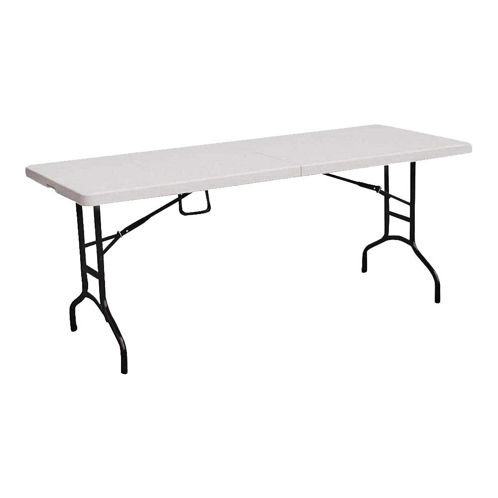 The Simple Space fold-in-half table is constructed of high-density polyethylene and has a convenient folding design for easy transportation and storage. The lightweight design, auto-locking feature, and convenient carry handle make it easy for anyone to set up and take down. The table is UV-protected and built for indoor and outdoor use. The patented steel frame design provides a sturdy foundation and is powder-coated. It is ideal for family game nights, outdoor activities, and more.