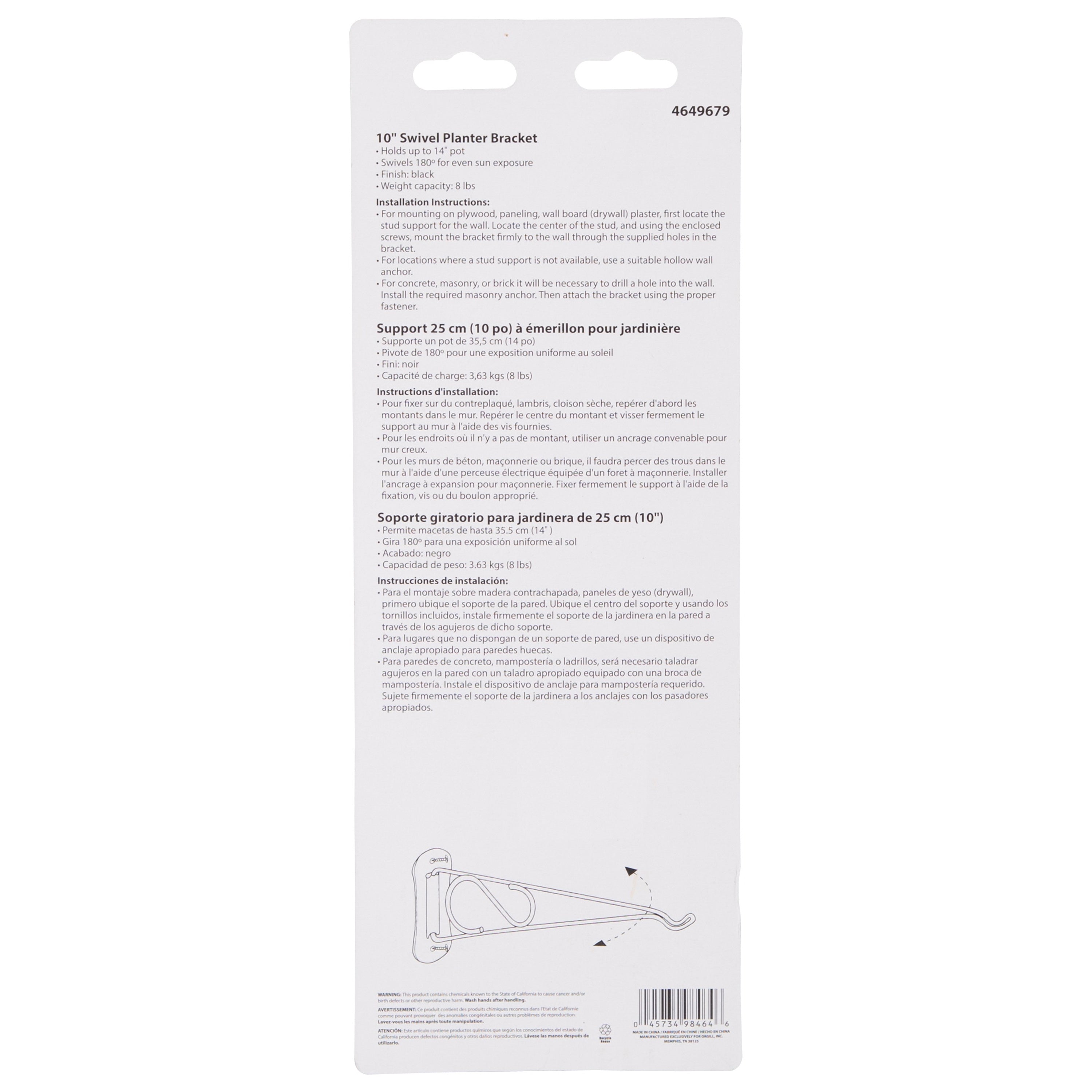 Holds up to a 14 in pot. Swivels 180 deg for even sun. 10 in planter bracket. Easy installation.
