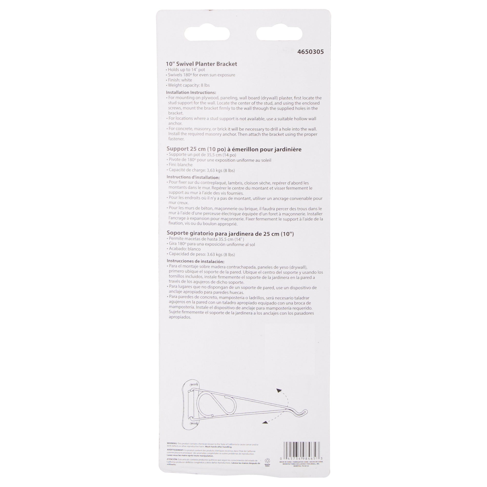 Holds up to a 14 in pot. Swivels 180 deg for even sun. 10 in planter bracket. Easy installation.
