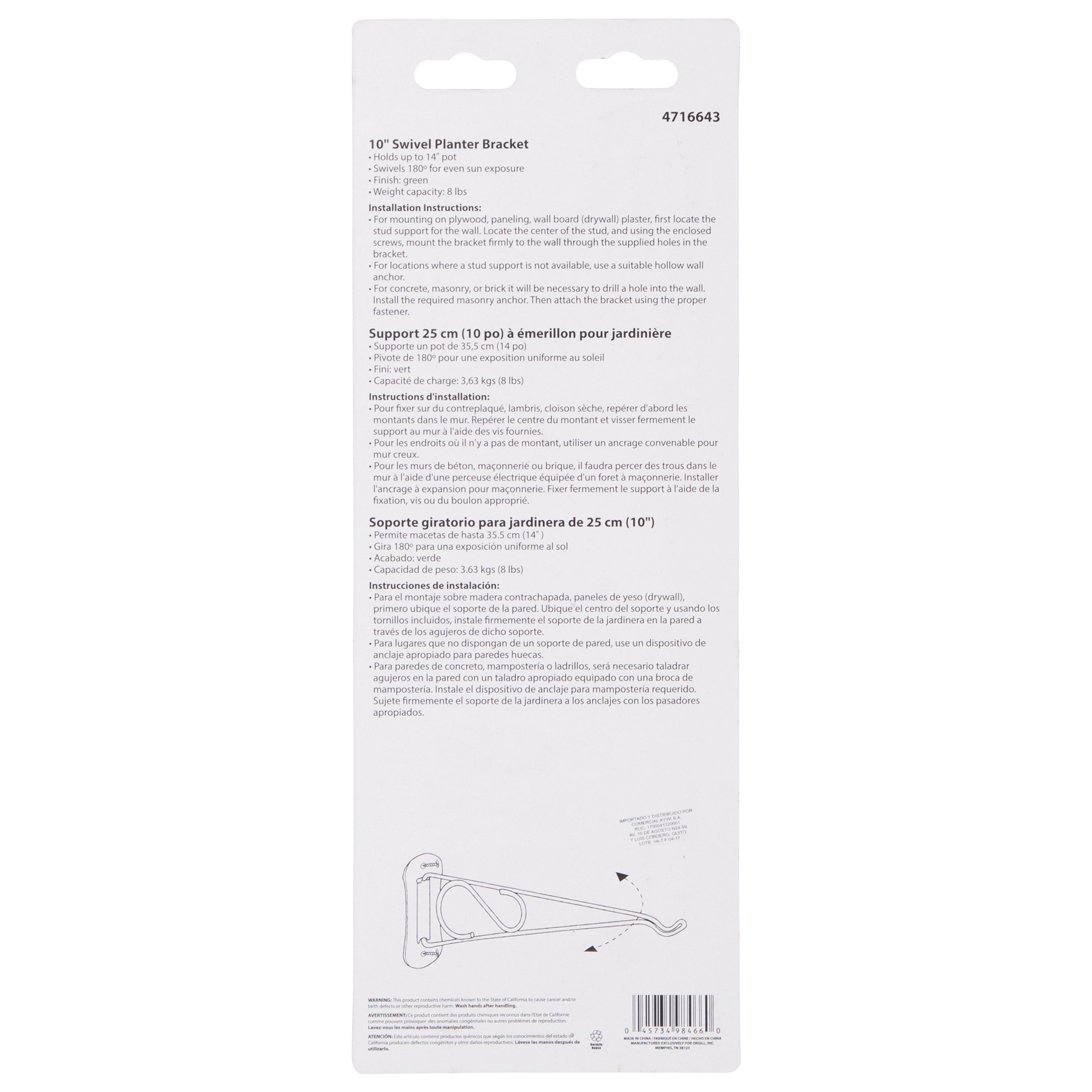 Holds up to a 14 in pot. Swivels 180 deg for even sun. 10 in planter bracket. Easy installation.