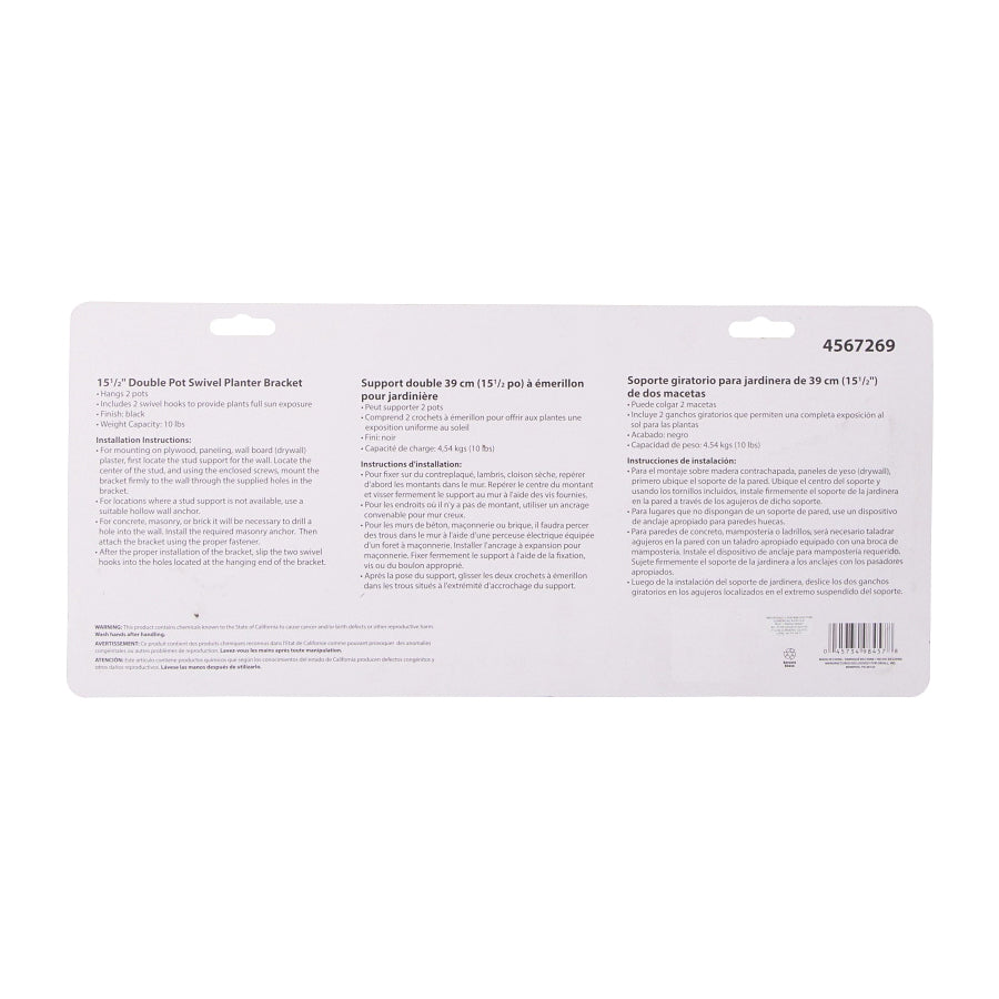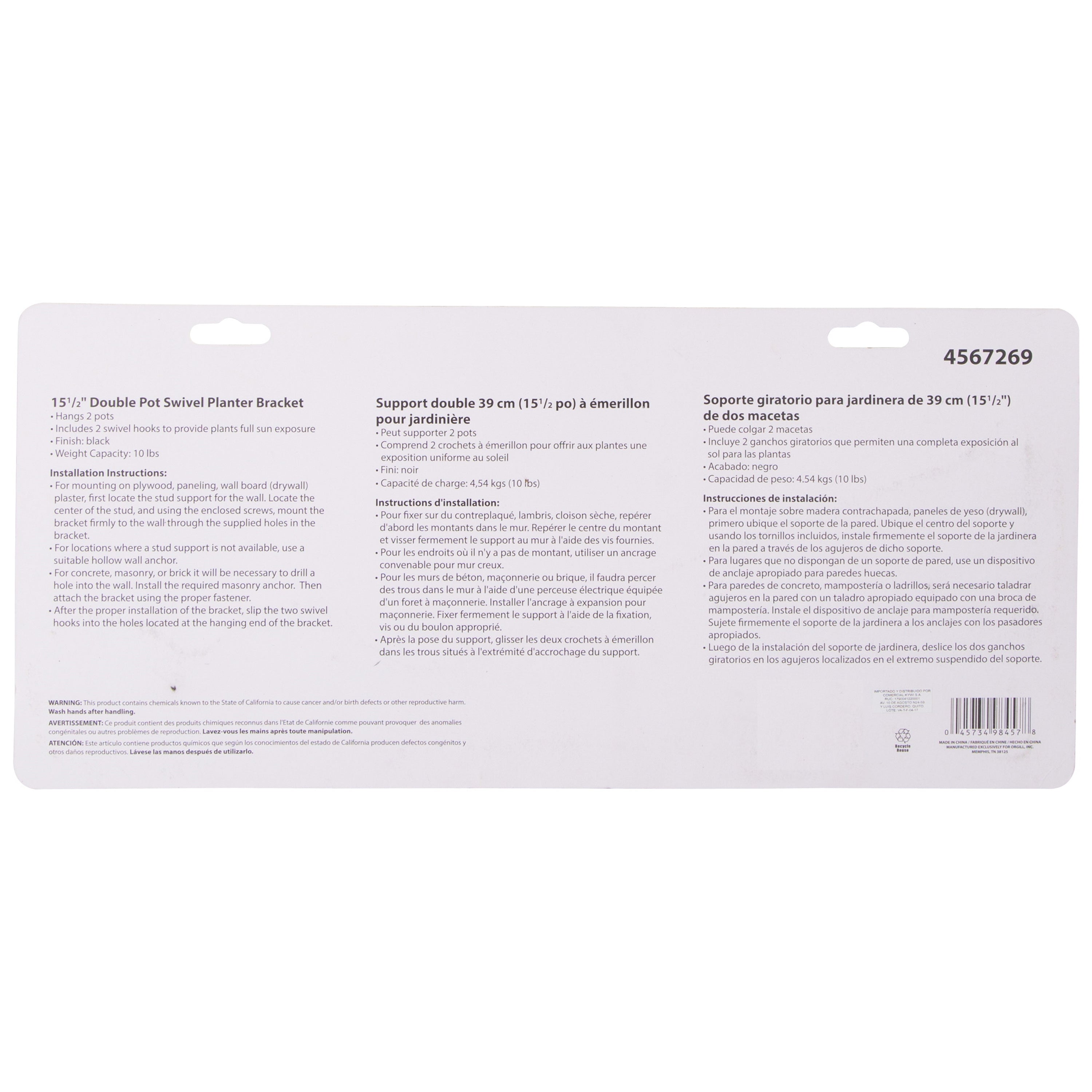Hangs 2 pots. Swivel pots a full 360 deg for full exposure. Installs in minutes. Swivel hooks supplied. Holds up to 20 in planters. Bracket of size 15 in.