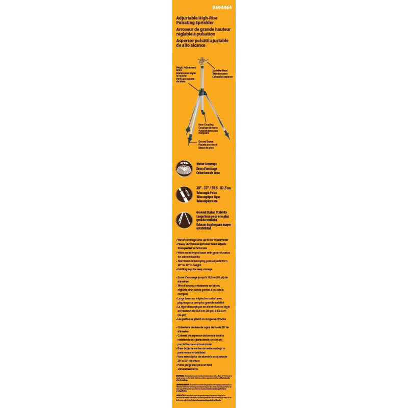 Metal head adjusts from partial to full circle. Wide tripod foldable legs for easy storage. Spiked legs for increased stability. Water area coverage up to 60 ft Dia.