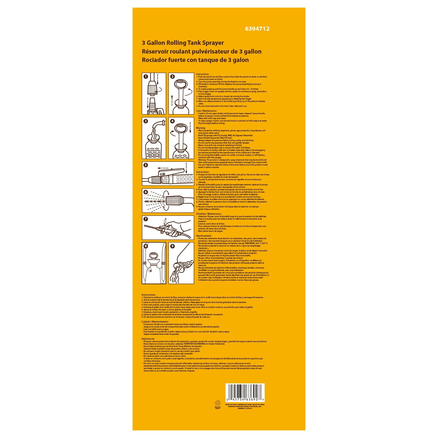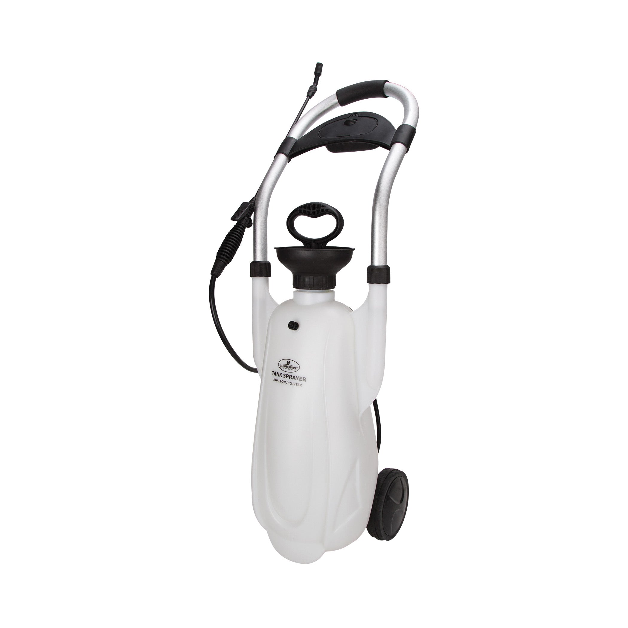 Rolling pressure sprayer with 2 wheels. General-purpose pressure sprayer ideal for spraying water, fertilizers, herbicides, pesticides and much more. Sprayer wand with adjustable sprayer nozzle and On/Off trigger lock. Pump and sprayer constructed of non-corrosive polyethylene, heavy-duty hose.