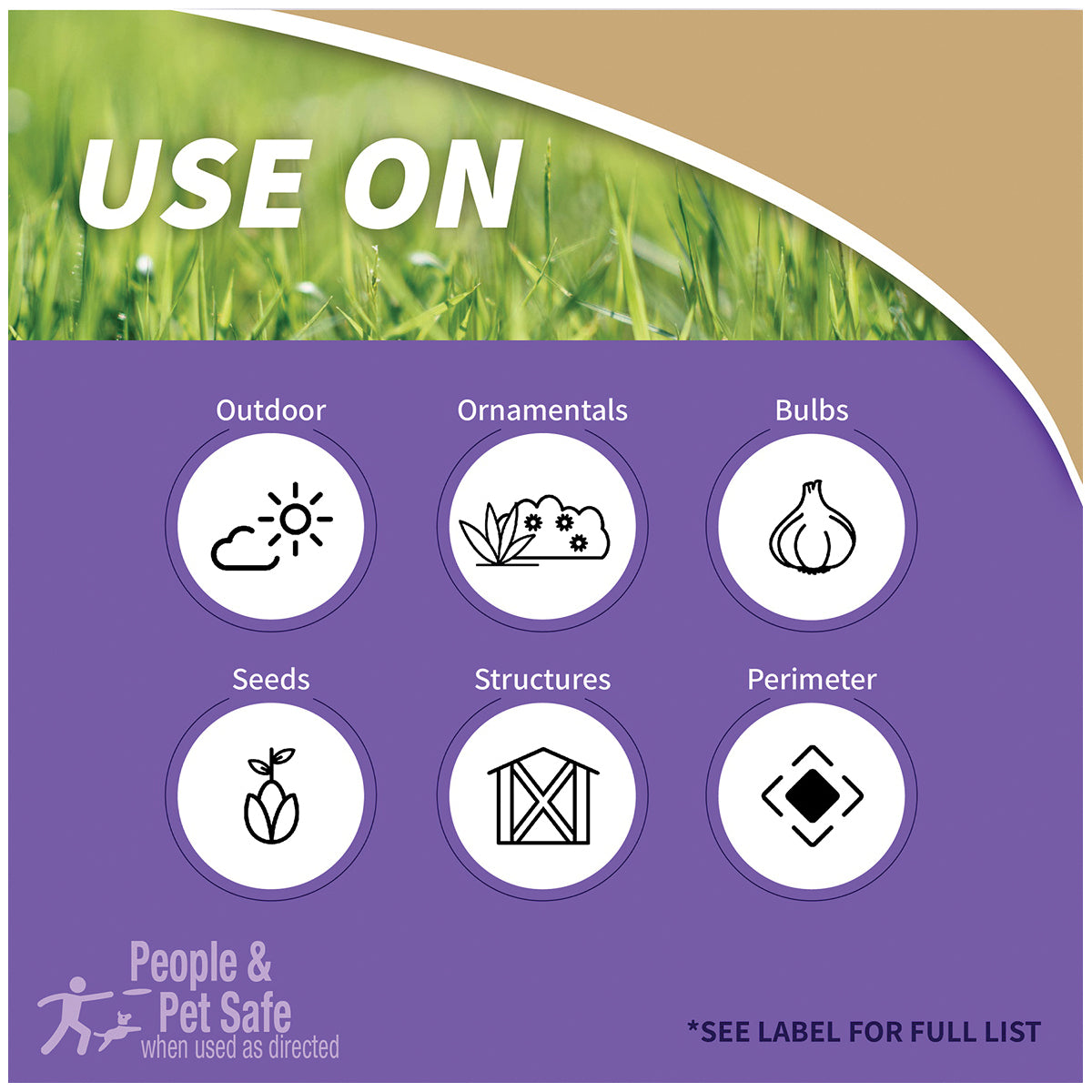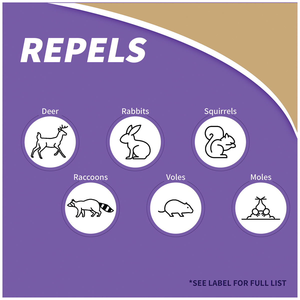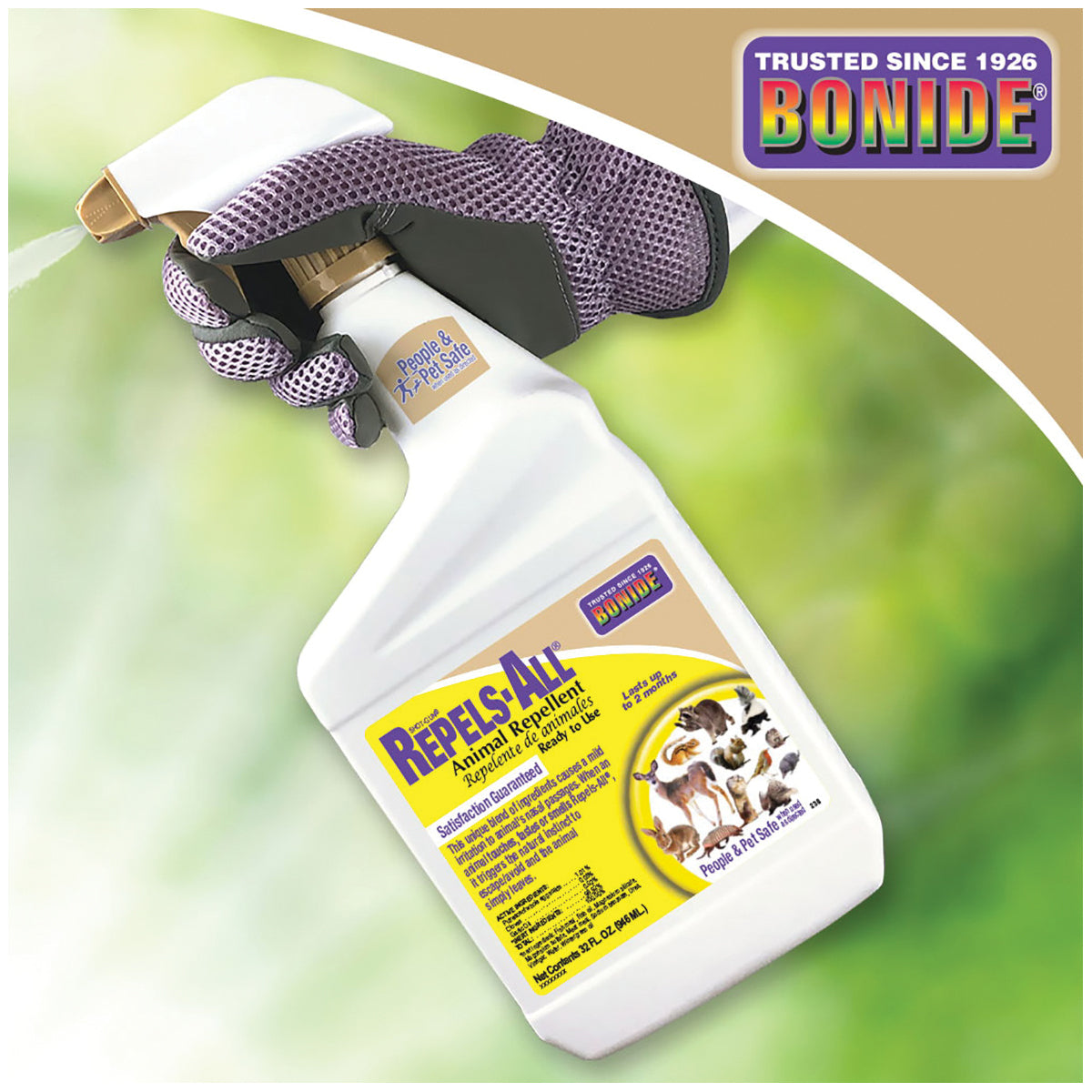 Use Repels-All Animal Repellent from Bonide to rid your yard and garden of all types of pests! This special formula defends against squirrels, deer, rabbits, chipmunks, mice, skunks, rats, beavers, racoons, porcupines, birds, groundhogs and more! Natural active ingredients act as a deterrent to critters without causing them any harm by creating a strong scent that will cause pests to avoid your space. When used as directed, this product is safe for use around people and pets. Apply directly to any outdoor area you wish to protect from pests. Can be used on structures outdoors, ornamental and edible garden items. Biodegradable ingredients will not cause harm to plants in your garden. This product arrives conveniently ready to use in a spray nozzle bottle. To use, spray directly to leaves, stems, branches, bulbs, seeds or hard surfaces of structures. For best results, refer to full instructions on product label. When used as directed, Repels-All Concentrate will deter animals for up to 2 months.