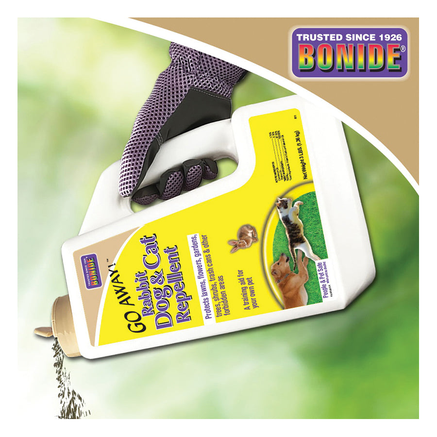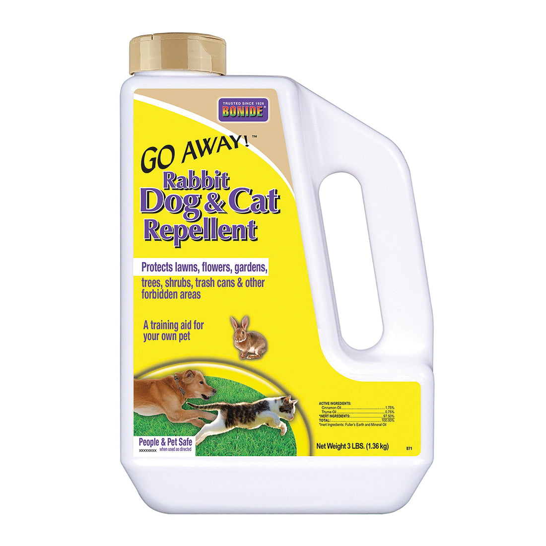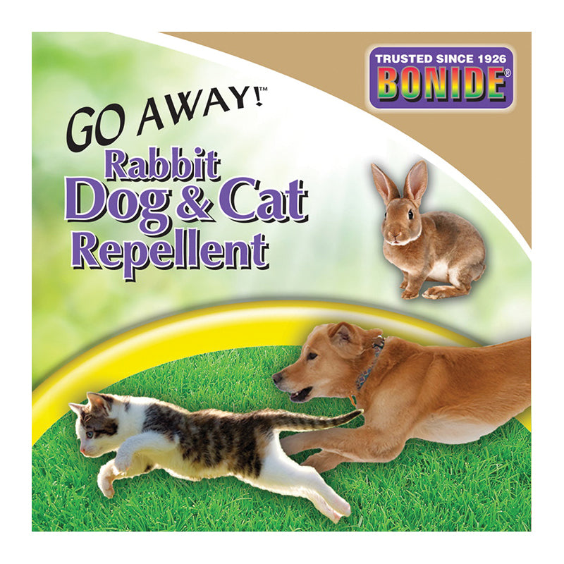 Keep animals away with Go Away! Rabbit, Dog & Cat Repellent Granules! This product is intended for outdoor use – great for lawn & garden, flower beds, trees, shrubs and other areas. Natural ingredients cinnamon oil and thyme oil act as a natural deterrent to keep animals away. When used as directed, this product is safe for use around people and pets. Go Away! Granules work as a training aid for your pets and stray critters in your yard. This product arrives conveniently packaged and ready to use! To use, lightly ad evenly sprinkle a band of 4 feet wide around the area you wish to protect. Reapply product after heavy precipitation or every two weeks for best results. This product is intended as an animal behavior modification tool. For best results, supplement with other behavior modification techniques when training domestic animals to break them of existing bad habits.