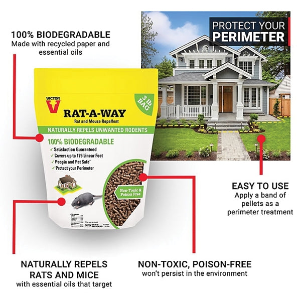 Looking for a way to deter rodents before they can set up residence in your home, Victor® Rat-A-Way™ rat repellent targets rodents sense of smell, making it a safe and effective way to repel rats and mice away from your home or elsewhere on your property. In addition, Victor® Rat-A-Way™ is easy to use. Simply spread a 1 to 3 in band around the perimeter of the area you would like to protect. The best part is it's all-natural.