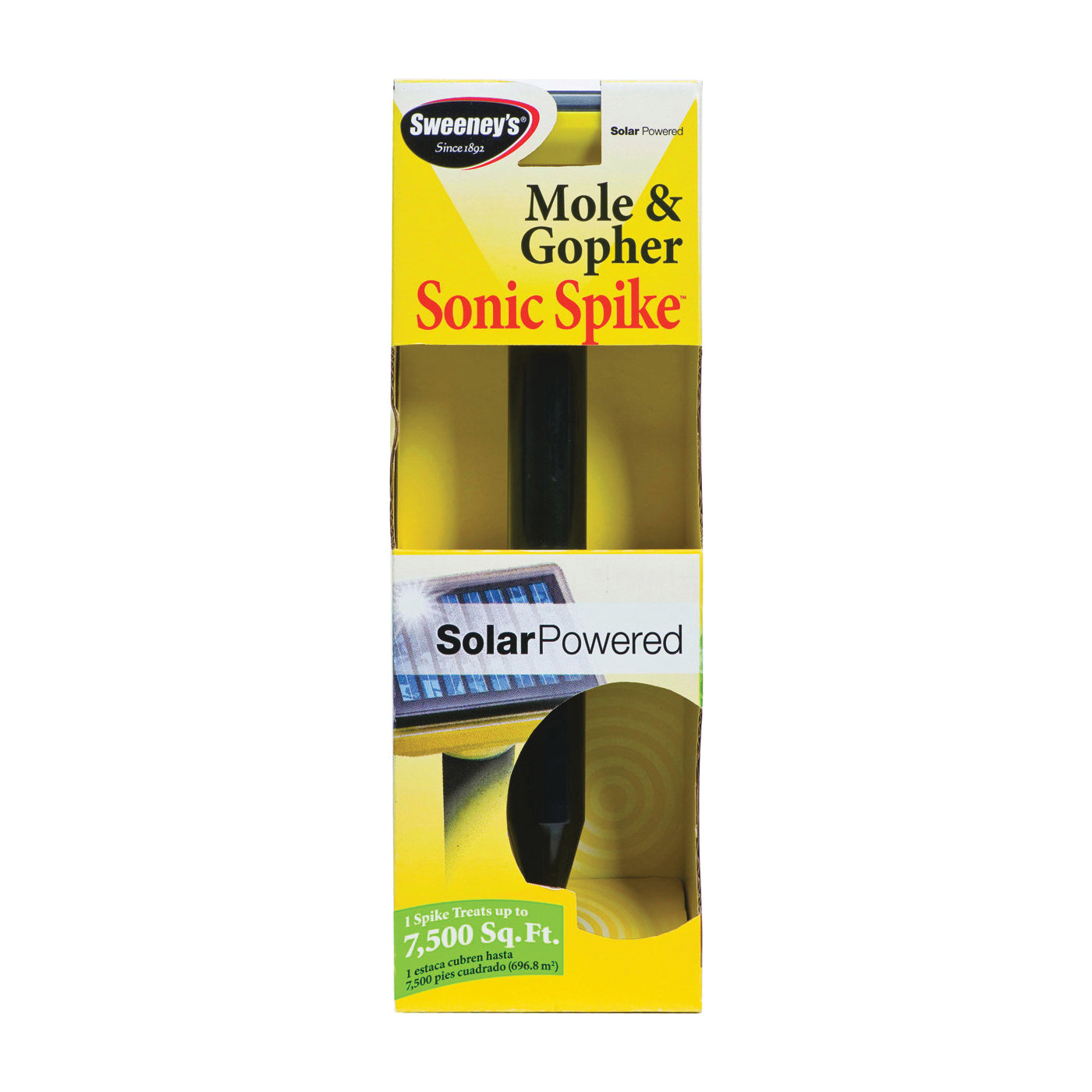 Sweeney's® solar powered mole and gopher repeller offers a poison-free way to drive away moles and gophers. Every 30 secs, sonic pulses penetrate the soil, emitting a penetrating sound, which is irritating to moles and gophers who are virtually blind and extremely sensitive to sound and vibrations. This method encourages moles to leave the property and the solar operated spike continues to discourage return visits. No batteries are required to operate the waterproof solar spike and one solar charge will last up to 5 days. The spike is built with a mow-over design and safe to use around pets. Allow 7 to 14 days before moles and gophers start to move away from the area.
