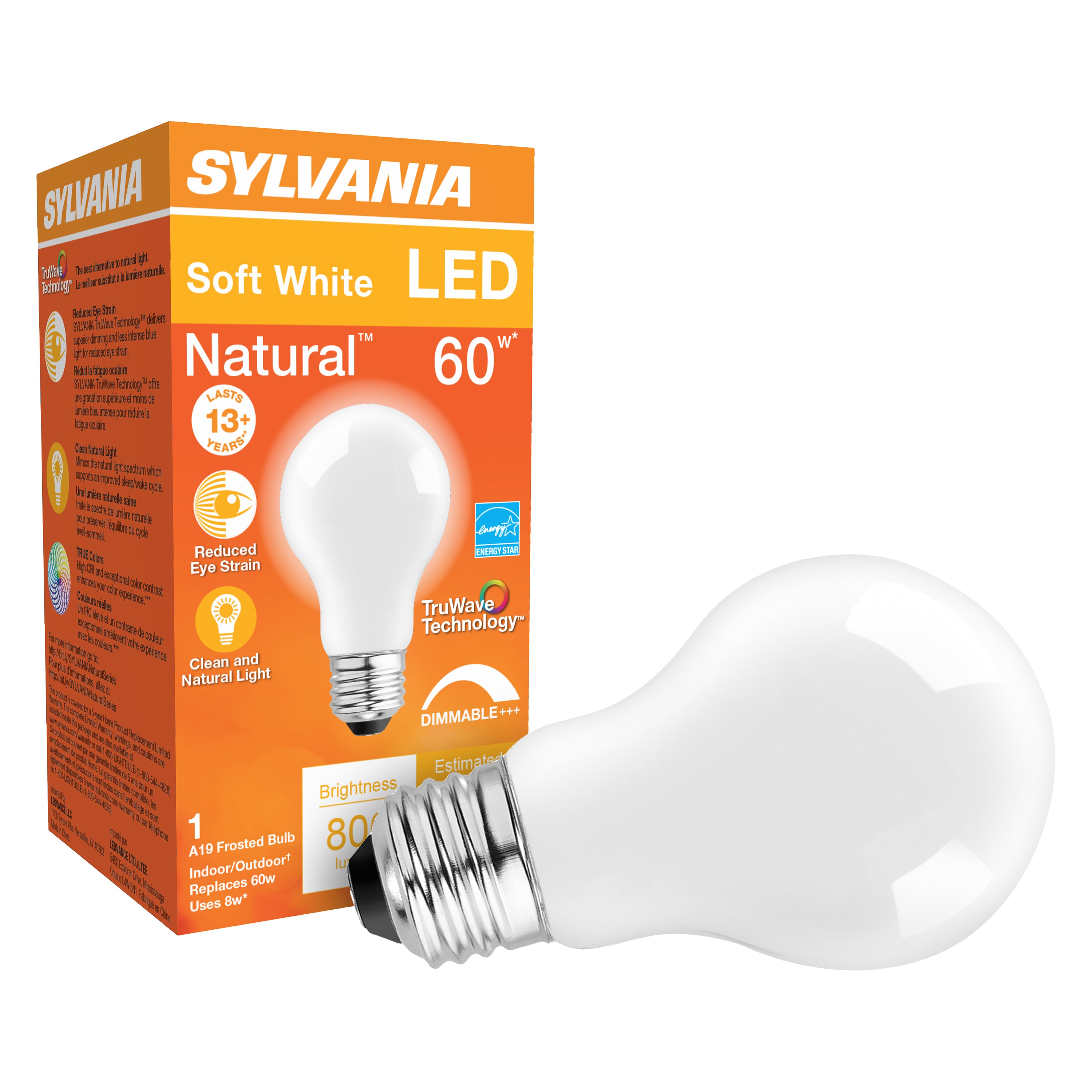 Sylvania LED Bulb, General Purpose, Wattage Rating: 8 W, 120 V, Lamp Base: E26, Lamp Shape: A19, Lamp Finish: Frosted, Lumens: 800 Lumens, Dimmable: Dimmable, Light Color: Soft White, Color Temperature: 2700 K, Average Life: 15,000 hr