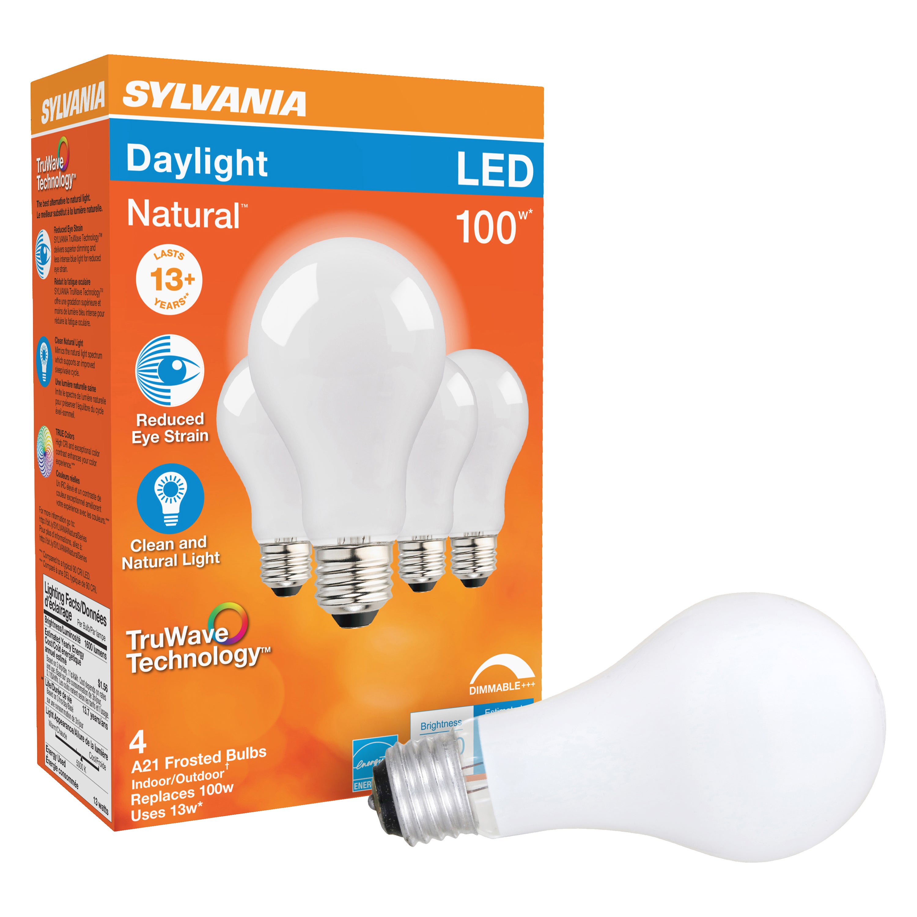 Sylvania LED Bulb, General Purpose, Wattage Rating: 13 W, 120 V, Lamp Base: E26, Lamp Shape: A21, Lumens: 1100 Lumens, Dimmable: Dimmable, Light Color: Daylight, Color Temperature: 5000 K, Color Rendering Index (CRI): 82, Average Life: 15,000 hr, Includes: (4) LED Bulbs