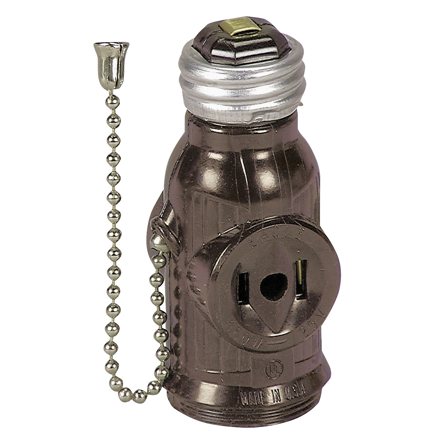 Socket to one socket and two side outlets. Pull chain controls lampholder. Side outlets are always on. 125 V, 660 W. UL listed.