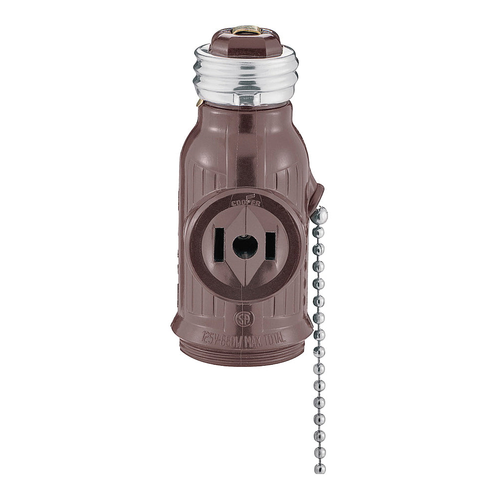 Socket to one socket and two side outlets. Pull chain controls lampholder. Side outlets are always on. 125 V, 660 W. UL listed.