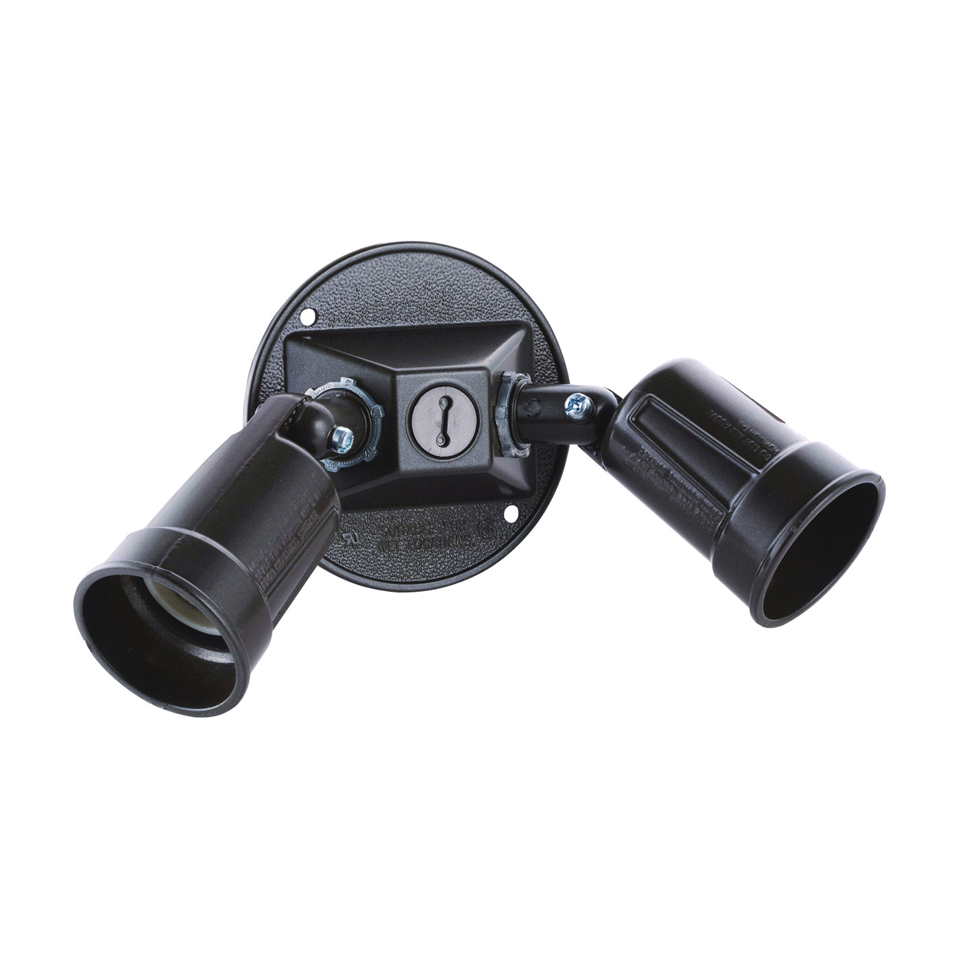 Die cast zinc with round 4 in cover and porcelain sockets. For wet locations. Use 75 to 150 W maximum, Par-38 lamps, not included. Includes multi-lingual instructions, gasket, screws and plugs. UL listed.