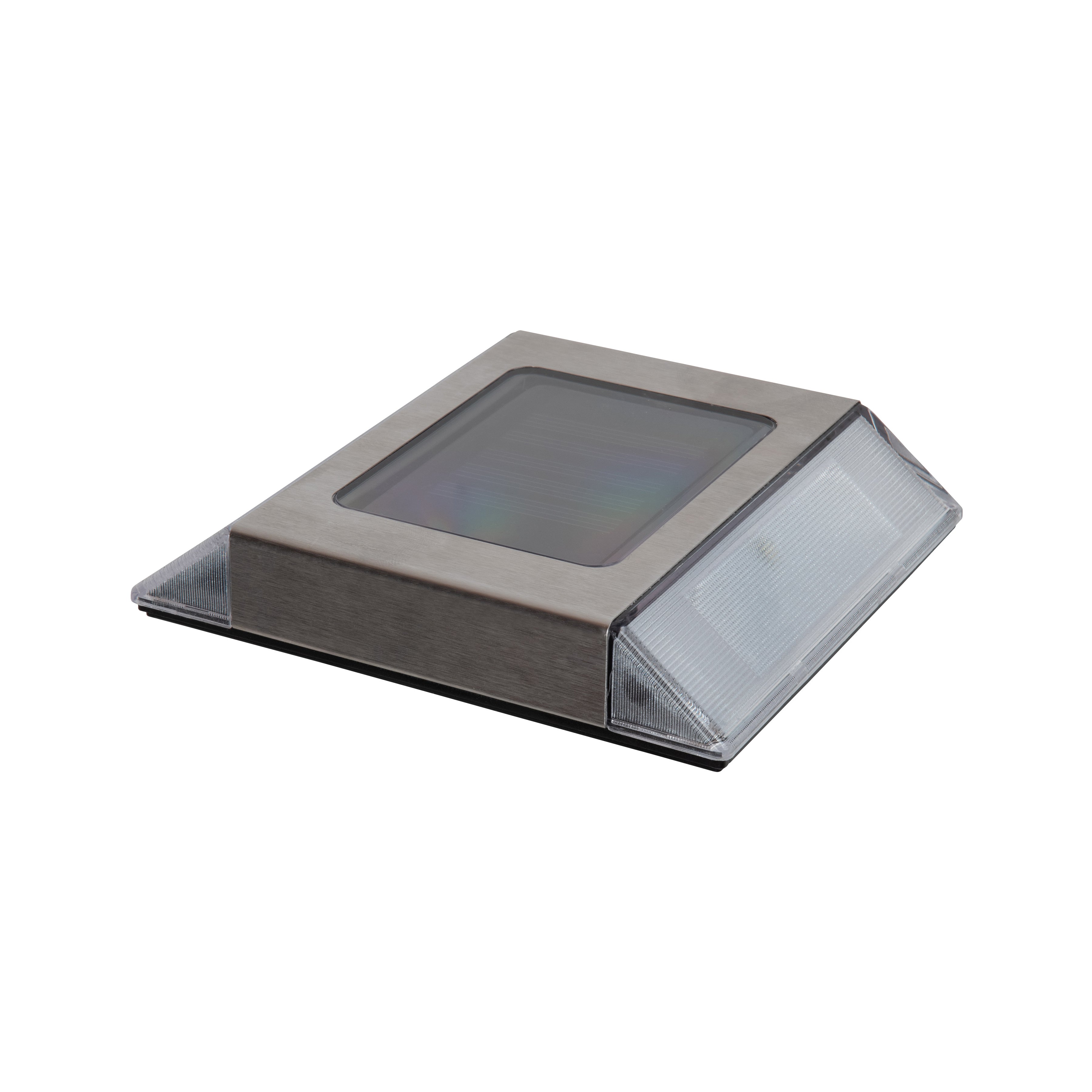Square solar deck light features 6 lumens. Steel and plastic construction. Stainless steel color. Batteries included.