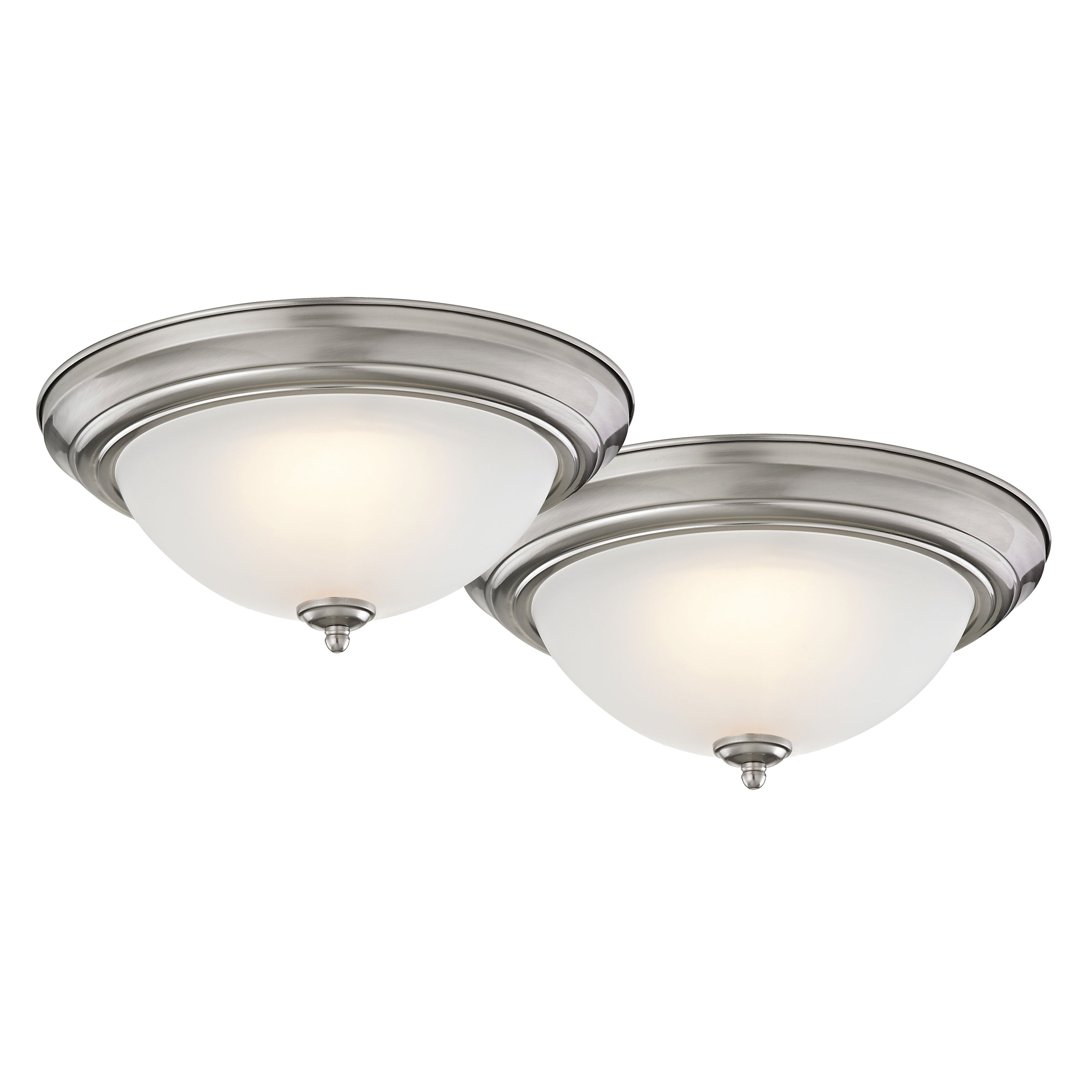 LED twin pack flush mount ceiling fixture, brushed nickel finish, frosted glass shade, 1500 lumens, 3000 K warm white, 120 V 20 W. Size: 13 in W x 6 in H, dimmable. LEDs included; no bulbs to replace, 5-year Limited Warranty, ETL Listed / Energy stars.