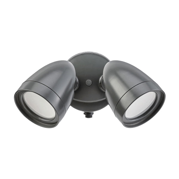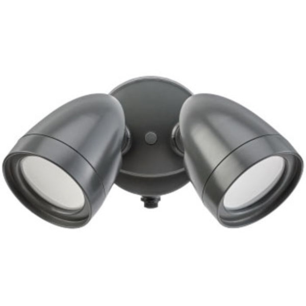 Security light, 2-headed with integrated dusk-to-dawn sensor. 20 W, 120 VAC, 1200 Lumens, 4000 K. Mounts to most junction boxes, direct wire. Rated lifetime 50,000 hrs. UV, IR and Mercury-free. UL/cUL- damp locations.