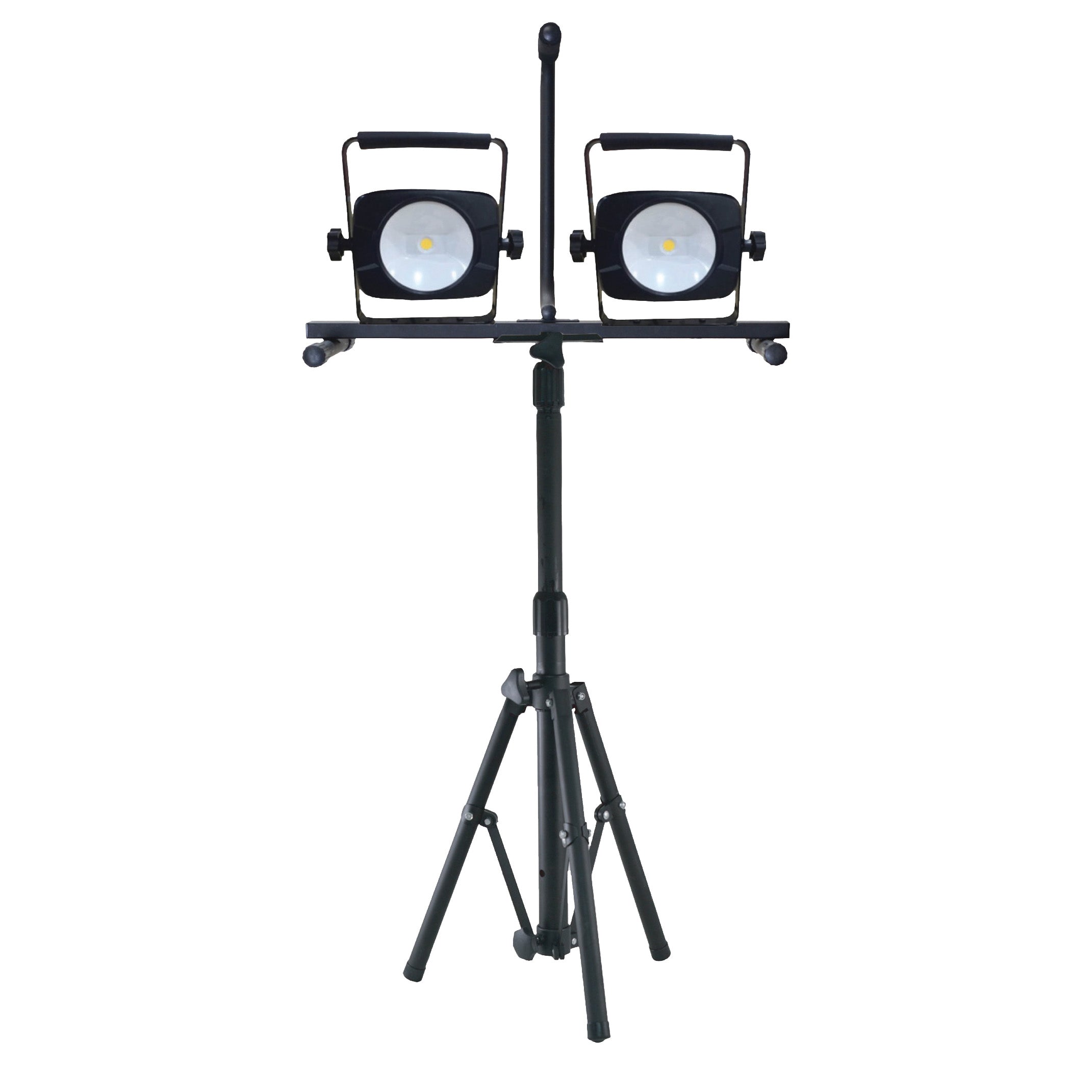 LED work light features 120 V, 52 W, LED lamp, polycarbonate Lens, 5000 lumens, color temperature: 4000 K, color rendering Index (CRI): 80, beam angle: 120 deg. Average Life: 50,000 hr. IP Rating: IP44,-4 to 104 deg F, Cord Size: 18/3 SJT, Includes: double tripod.