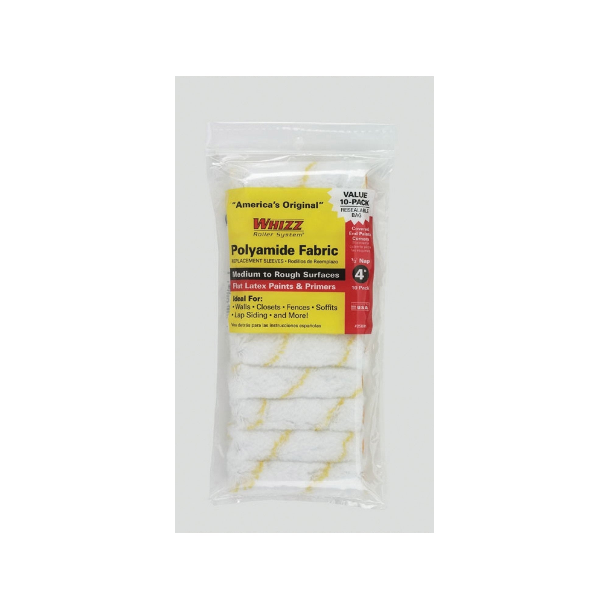 Covered end paints corner. Works on all WHIZZ handles for 4 in and 6 in. Ultra low splatter. More paint rolled per dip. Easy cleanup. Resealable bag.