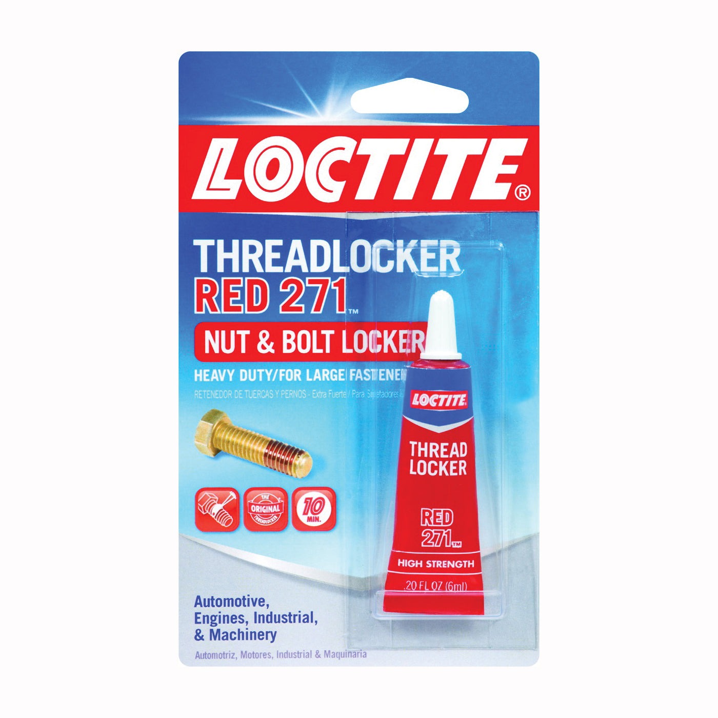 Loctite® Threadlocker Red 271 is designed for the permanent locking and sealing of threaded fasteners. The product cures when confined in the absence of air between close fitting metal surfaces. It protects threads from rust and corrosion and prevents loosening from shock and vibration.