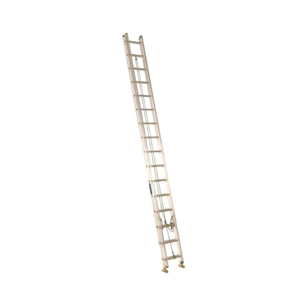This Louisville 32 ft aluminum extension ladder has a 225 lb load capacity, rated ANSI type II. It is equipped with the maxlock rung lock, custom engineered from a patented, advanced molecular polymer, maxlock is the strongest, toughest, lightest rung lock ever made. This ladder also includes the patented progrip slip-resistant tread integrated onto the ladder caps to protect the work surface from damage. Quicklatch runglock system that provides a simple, intuitive method of securing the fly and base sections of the ladder when extended. This ladder also features outside slide guides, D-shape rungs fully serrated for a slip-resistant surface, rope and pulley, modified I-beam for a more stable connection and to prevent twisting and swivel safety shoes to be used as tread down or in-spike position.