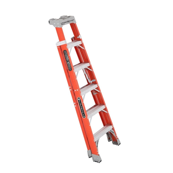 This Louisville 6 ft fiberglass cross step ladder has a type IA duty rating with load capacity of 300 lb. This ladder combines the shelf and step ladder for a 2-in-1 combination made to take on multiple placement locations. The shelf design and its unique ProTop™ and innovative locking mechanism allows for positioning against a wall, building or pole. When unlocked, this ladder sets up as a regular step ladder. The angles of the step ladder allow the capability to get closer to the work area. The cross-step ladder is equipped with a V-shape ProTop™ with non-marring slip-resistant rubber tread that allows it to be placed safely on corners and poles. This ladder's ProTop™ also features a magnet and multiple slots that allow quick and easy access to your tools.