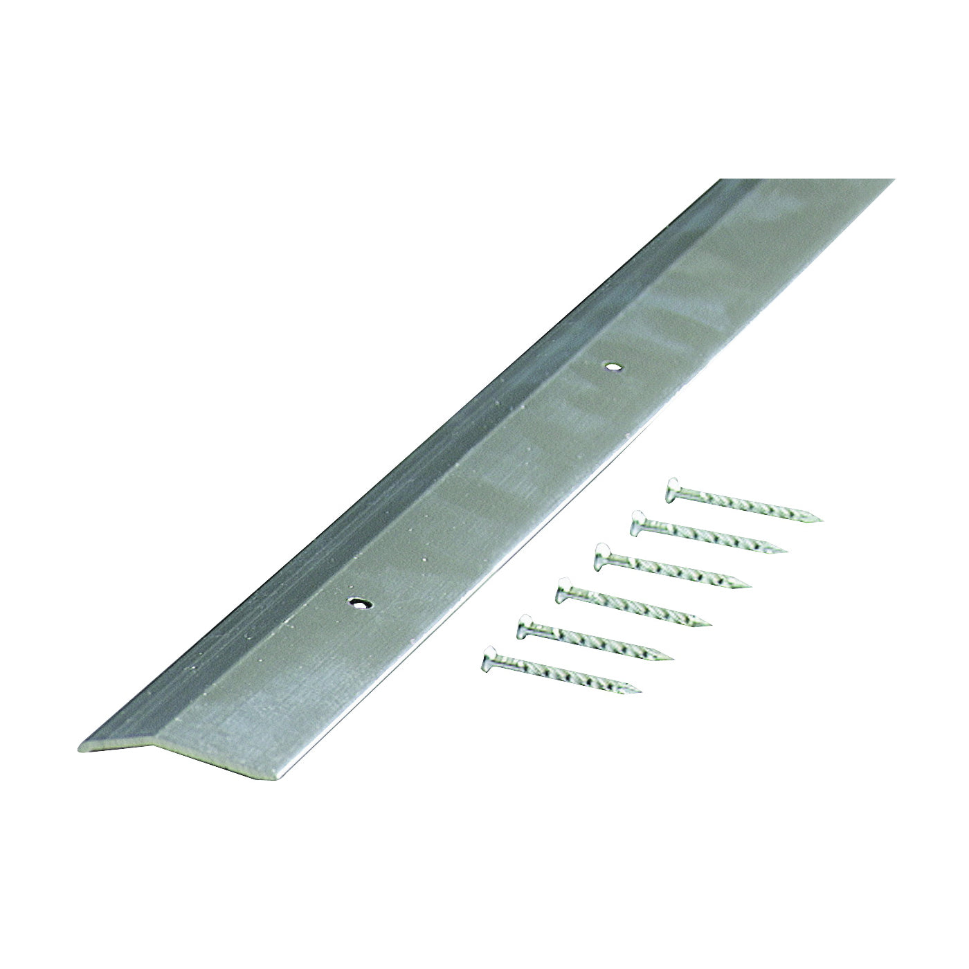 The 1-3/8 x 72 in polished smooth carpet trim easily covers a seam or gap between two flooring surfaces of unequal height. Carpet trim prevents carpet edges from fraying, vinyl floor seams from curling and creates a smooth transition between different flooring surfaces. Aluminum trim is easily secured to wood and concrete floors with provided screw nails. For installation on concrete floors use wooden pegs.