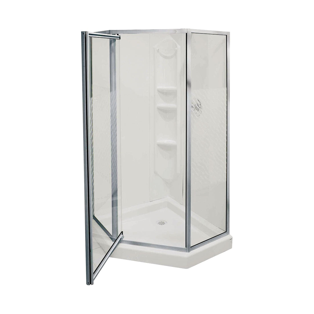 Neoangle shower stall kit. Three-piece white polystyrene wall, 3 built-in shelves and 1 towel bar, textured base, right or left installation pivot door, tempered glass panel with white stripe design, drain included. 38 in x 38 in x 74 in. 1 year warranty.