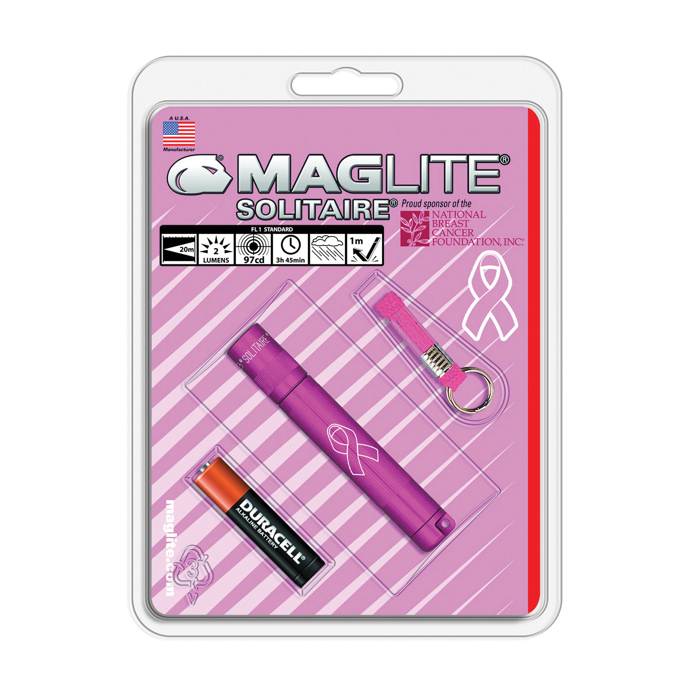 With National Breast Cancer Foundation (NBCF) logo, pink, with pink key lead and 1-AAA battery in blister packaging. Can be seen for 20 m. Battery lasts 3 hrs and 45 mins. Weather resistant, 1 m drop resistant. For key chains and handbags. A USA manufacturer.