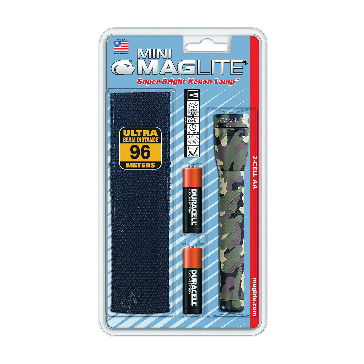 Contains Mini Maglite flashlight, multi-purpose polypropylene belt holster, a spare bulb in the tailcap and two premium AA alkaline batteries. Made by a USA manufacturer. 14 Lumens, runs 5 hrs and 15 mins. 1 m drop resistance.