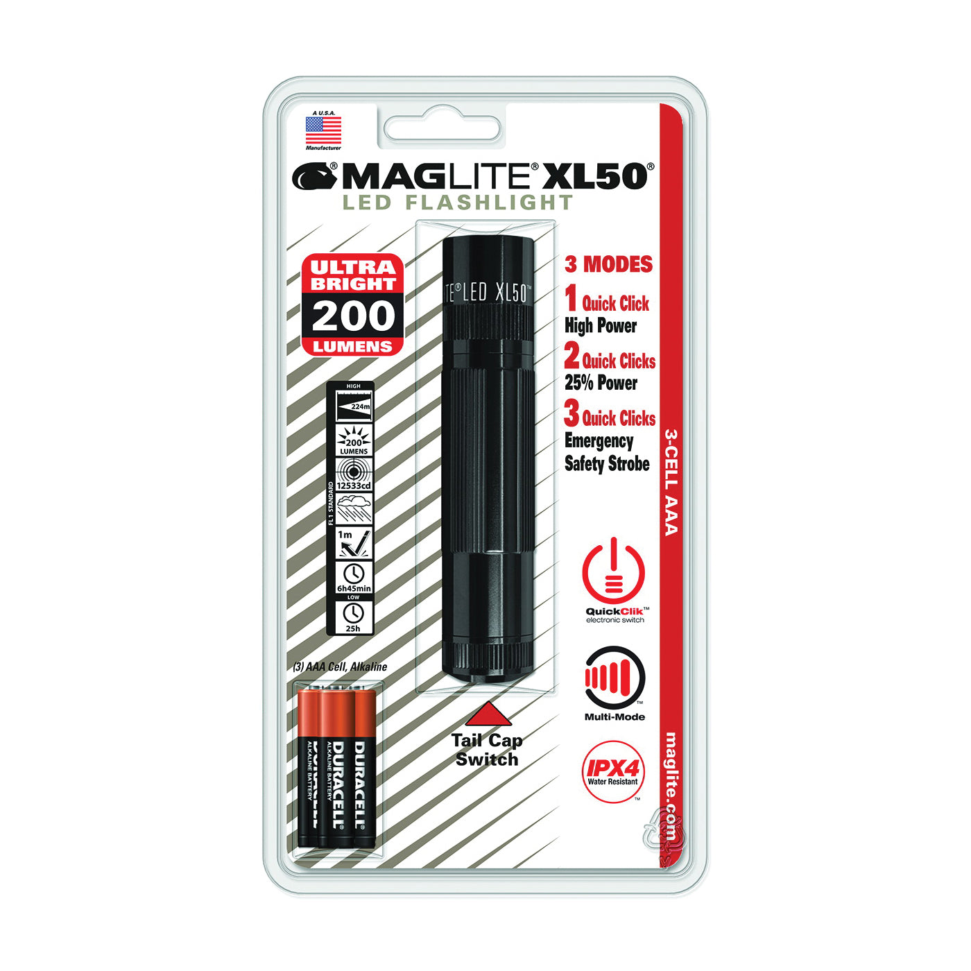 MAGLITE® XL50™ LED flashlight a user-friendly, performance oriented torch, featuring a push-button tail cap switch with 3 selectable modes, driven by the next generation MAG-LED® technology.