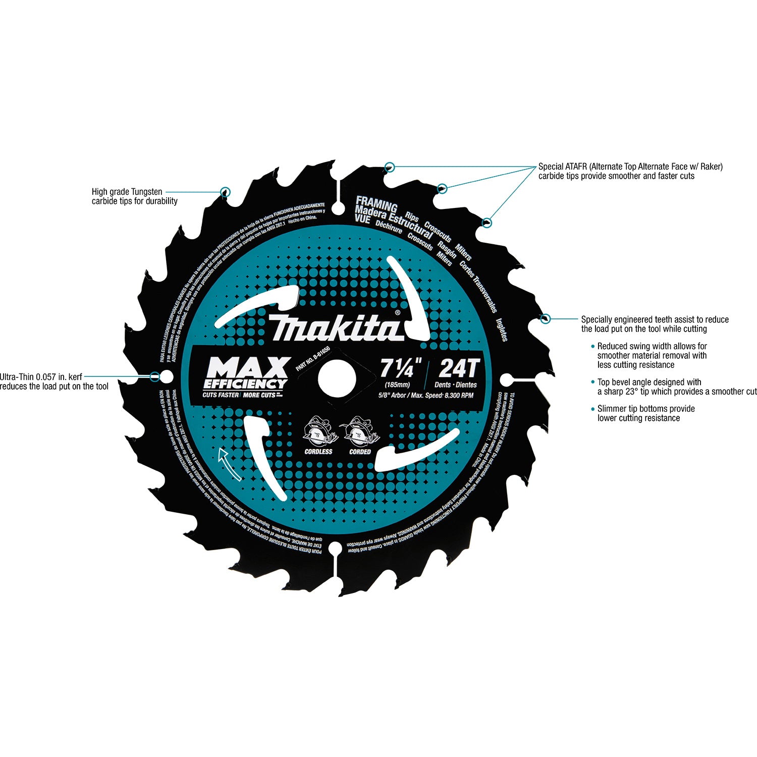 The 7-1/4 in 24T carbide-tipped max efficiency ultra-thin kerf framing saw blade is ideal for a framers using cordless circular saws for a full range of wood cutting applications. The ultra-thin kerf design (only 0.057 in) and specially engineered blade teeth to assist in reducing the load put on the tool while cutting, with a reduced swing width that allows for smoother material removal with less cutting resistance. The result is increased cutting efficiency and users get up to 70% faster cutting and up to 70% more cuts per charge compared to standard blades. The high-grade tungsten carbide tips are engineered for improved durability and longer blade life and the special ATAFR (Alternate Top Alternate Face with Raker) carbide tips provide smoother and caster cuts. Added features including a blade coating for reduced pitch build-up.