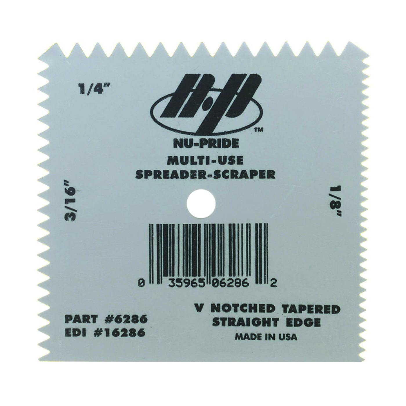 Multi-use spreader/scraper. Won't rust or corrode. Each side of spreaders has a different notch size. Made in the U.S.A. Sizes: 3/16, 1/4, 1/8 'V' and tapered edge.