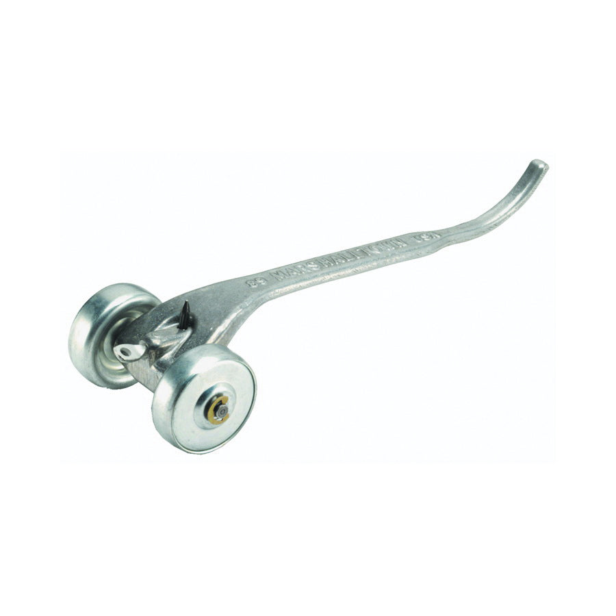 Large 1-3/4 in skate wheels. Strong aluminum handle is contoured to fit the hand and squared off at the end. Hardened nail, adjustable to the proper depth, can be securely tightened by slipping the nail in the eye of a spade bolt and twisting.