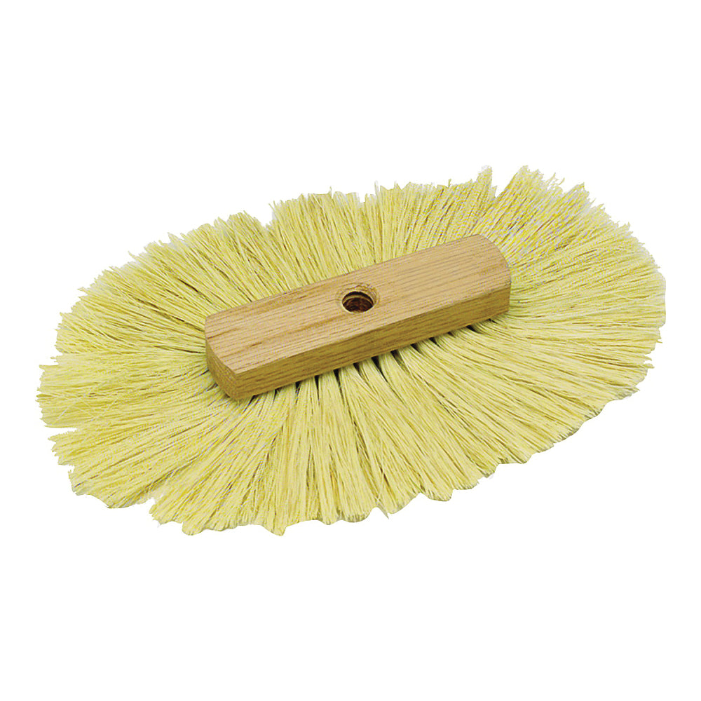 Made of 100% 4 in white Tampico hemp bristles set securely into a wooden base. Can be hand held or center-hole pole mounted.