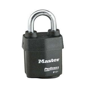 The Master Lock #6121D ProSeries Weather Tough covered laminated padlock packed in carded packing for showroom display features a 2-1/8 in (54 mm) wide heavy steel body to withstand physical attack and a 1-1/8 in H, 5/16 in Dia hardened boron alloy shackle for superior cut resistance. The exclusive cover protects this padlock from harsh elements and a high security, rekeyable 5-pin cylinder with spool pins is virtually impossible to pick.