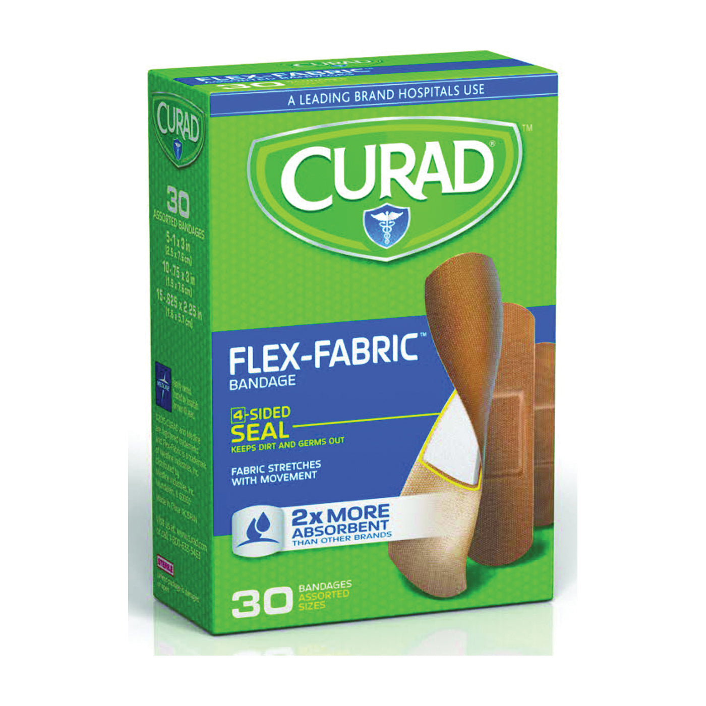 • Curad® Flex-Fabric bandages are made of woven fabric designed to stretch, bend, breathe and stay on comfortably, even when wet
