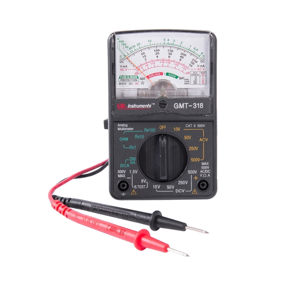 This multifunctional analog multimeter was designed for the homeowner, hobbyist or professional needing to make electrical and electronic equipment measurements. Capable of measuring 6 functions on 14 ranges on it is easy to read color-coded analog display you'll find yourself reaching for this handy unit almost every time. Unit tests AC and DC voltage of 10-50-250 and 500 V, DC current 250 mA, up to 50K of resistance, -20 to +56 dB decibels on AC voltage ranges and common household batteries from 1.5 V thru 9 V. Unit includes built-in 0 Ohm adjustment dial allowing you to reset prior to resistance testing and to perform internal battery test function. Unit incorporates fuse overload protection circuitry to protect the user and a mirror scale is provided to reduce the possibility of parallax errors. Ships with test leads and a tri-lingual instruction manual and includes a 1 year warranty. Common measurements with this unit include - testing household batteries for charge level, troubleshooting various low voltage circuits, testing wall receptacles for proper voltage and grounding and troubleshooting electrical cords, stings of lights, fuses and switches to determine if they are operating properly or if a break in the circuit exists and the item in question needs to be repaired or replaced. The decibel feature of this multimeter is used for transistor gain measurement in electronic circuits and should not be confused with audio decibels.