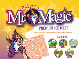 "A unique, proprietary formulation of potassium chloride (a fertilizer), calcium chloride, magnesium chloride and sodium chloride. Mr. Magic® is coated with CMA (calcium magnesium acetate) and works faster and at lower temperatures – down to -25°F – to melt more snow and ice than most other products. The unique safety orange color coating assures visible, complete coverage, and when applied as directed, Mr. Magic® is safe on the environment, on concrete and brick, and for pets, and is faster acting than rock salt. Mr. Magic® is one of our most popular deicers for residential and commercial properties."