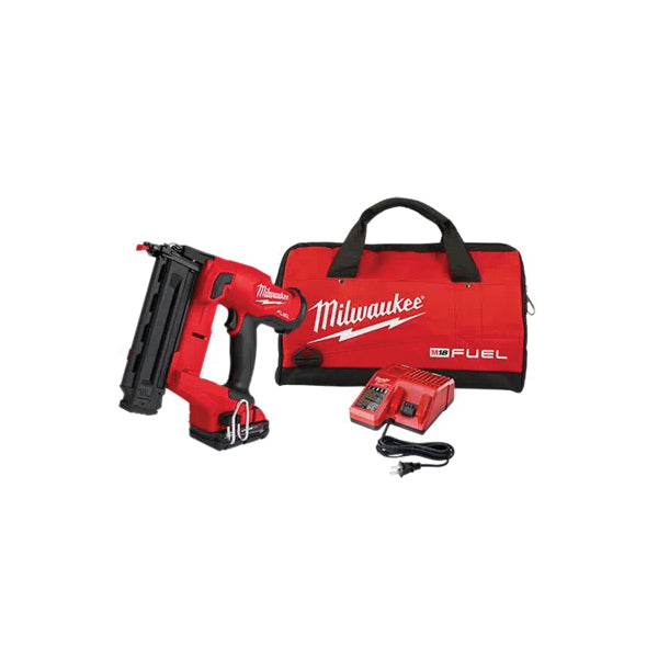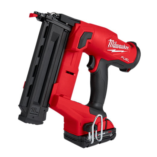 Our M18 FUEL™ 18 ga brad nailer kit delivers peak productivity at your jobsite, providing you with unmatched nailing performance without the hassle of a compressor and hose. Leveraging our nitrogen air spring mechanism, the brad nailer allows you to consistently sink nails to the proper depth in hard and soft woods while leaving clean nail holes matching the head of the nail. The combination of our POWERSTATE™ brushless motor and REDLINK PLUS™ intelligence delivers you with unmatched fire rate with zero ramp-up time keeping you efficient throughout your day. Additionally, the cordless brad nailer operates using our REDLITHIUM™ batteries and sealed compressed nitrogen to drive each nail, completely eliminating the cost of gas cartridges and maintenance associated with competitors' nailers. The 18 ga nailer is compact in size and very lightweight, providing you with unmatched access into tight spaces and limiting your fatigue throughout your day. The M18 FUEL™ 18 ga brad nailer delivers the pneumatic performance that professional carpenters and remodelers expect with the freedom and convenience of cordless. In addition to the brad nailer, this kit includes one M18™ REDLITHIUM™ CP2.0 battery pack, an M18™ & M12™ multi-voltage charger, a reversible belt hook and a contractor bag.