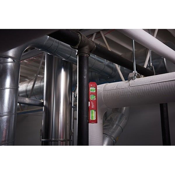 The Milwaukee billet torpedo level features amplified rare earth magnets for over 2X the holding power of leading competitors. The maximized viewing area ensures that the user can make a fast and accurate readings of 1/8 in and 1/4 in per ft in any position. The optimized top and back side pipe grooves make this the optimal tool for working with both small and large diameter pipes. The 48-22-5107 Milwaukee billet level also offers a weld clearance and laser etched ruled edge.