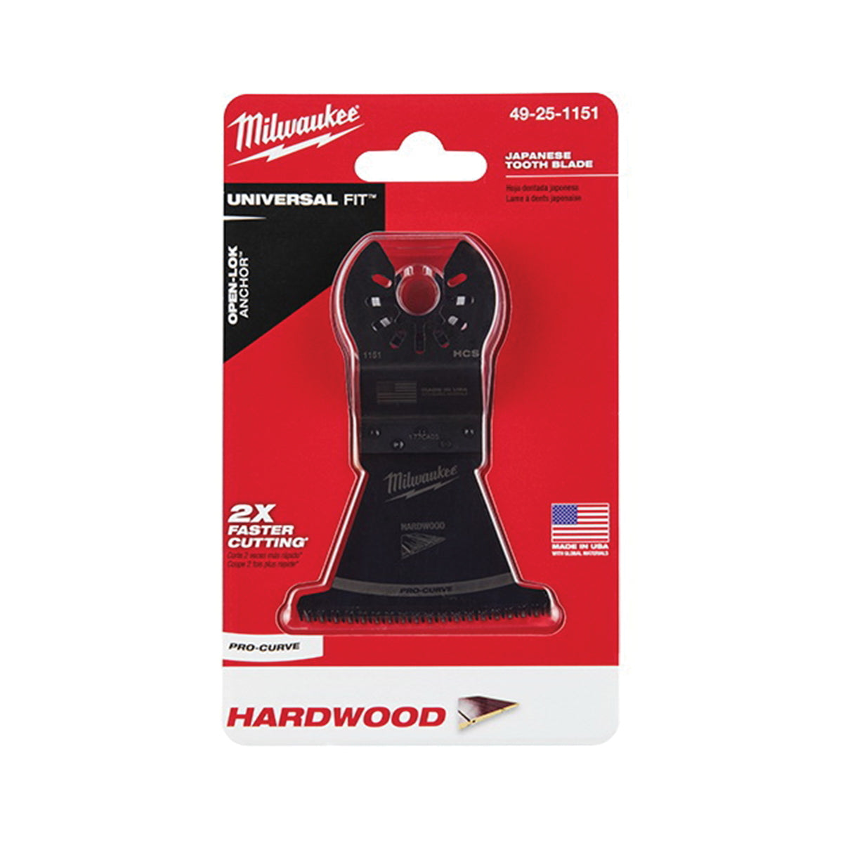 Our universal fit OPEN-LOK™ HCS Japanese tooth PRO-CURVE™ hardwood blades for oscillating multi-tools are made from premium HCS. This hardwood multi-tool blade has precision triple-ground Japanese teeth and a includes PRO-CURVE™ tooth edge, giving you greater control and accuracy in plunge cuts. This is Milwaukee's top multi-tool blade for making precise cuts with a smooth finish in hardwood and can also be used in other woods, PVC, drywall and other soft materials. This Milwaukee® blade delivers up to 2X faster cuts than the previous generation of HCS blades. This multi-tool blade is designed and made in the USA with global materials.