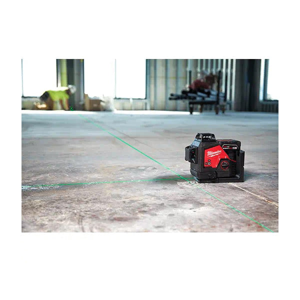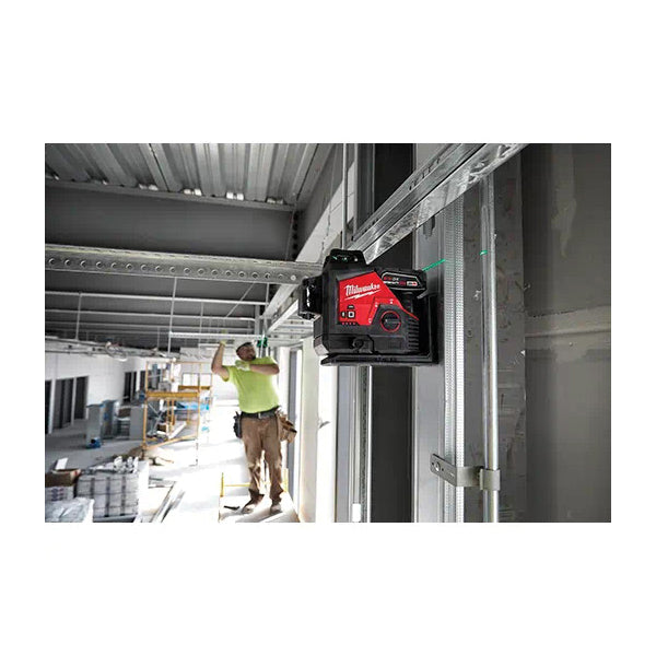 Our M12™ Green 360 deg 3-plane laser kit provides you with all day runtime and best visibility in its class. You'll get 15+ hr of continuous runtime when paired with an M12™ REDLITHIUM™ 4.0 XC battery for ultimate productivity. The high-intensity green laser offers you superior visibility up to 250 ft (Dia) for long range applications. The three 360 deg planes include horizontal and two vertical lines for fast and easy alignment, leveling, squaring and transfers allowing you to easily layout large spaces with one tool. The integrated bracket features a micro control and pivots on plumb point for easy and fast alignment. The amplified rare earth magnets provide a strong hold and will not slide on steel studs, while an integrated hang hole makes setup easy and efficient in any environment. As a part of the industry leading Milwaukee® M12™ system, this 360 deg laser level is compatible with all M12™ batteries.