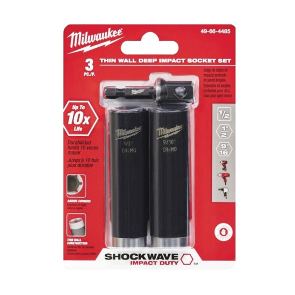 Milwaukee SHOCKWAVE Impact Duty Deep Well Socket Set, Specifications: SAE Measuring Type, 1/2 in Drive, 1/2 to 9/16 in Socket, 6-Point, Steel, Black, Dimensions: 1-7/8 in L, Includes: (1) 1/2 in Thinwall Deep Impact Socket, (1) 9/16 in Thinwall Deep Impact Socket, (1) 1/2 in Bit Holder