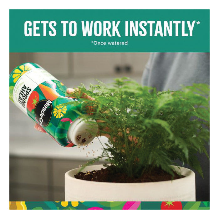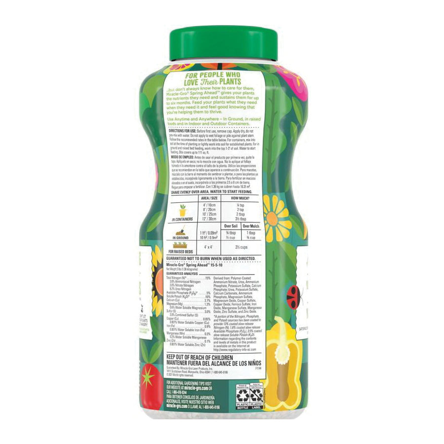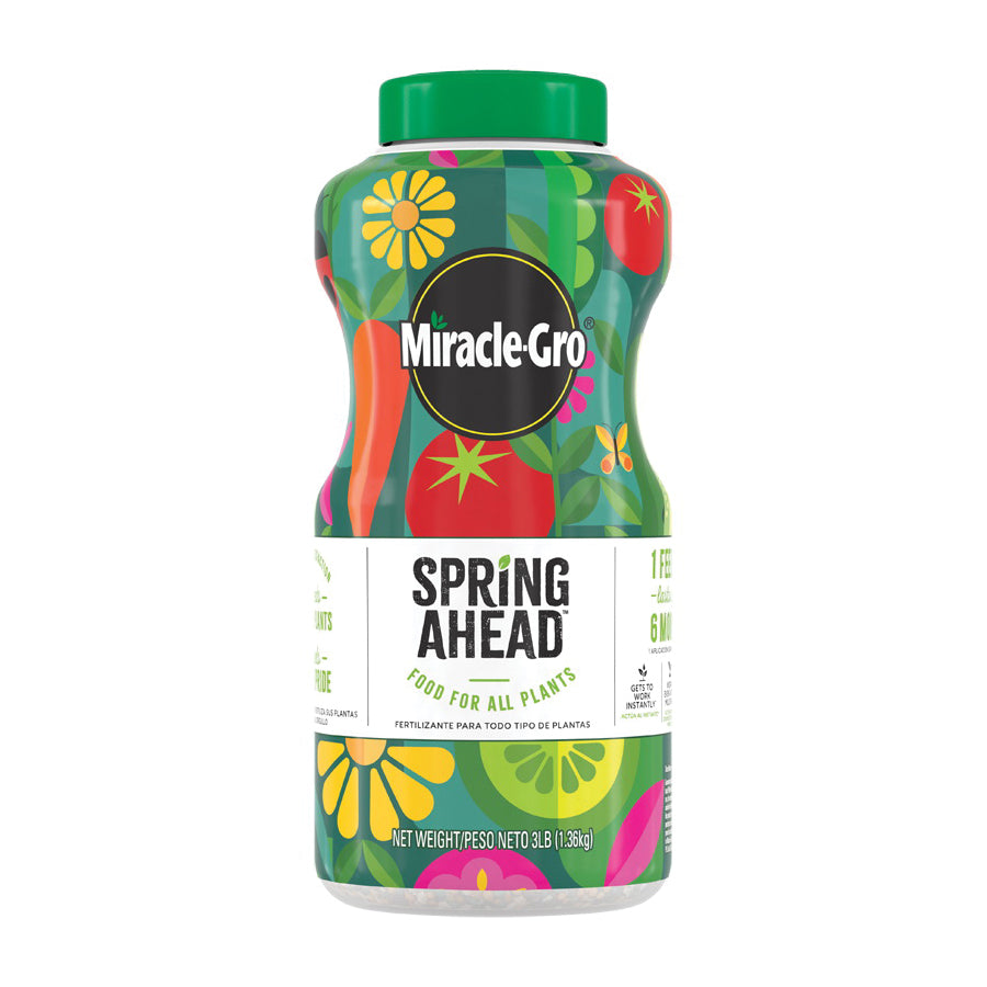 Did you know that plants get hangry, too That's why we created Miracle-Gro Spring Ahead, a plant fertilizer that keeps your plants happy and fed for up to 6 months. This plant food gets to work instantly (once watered in). You can apply it to any plant, anytime, anywhere. Have a vegetable garden in your backyard Spring Ahead. What about indoor plants in your living room, or flowers in a raised bed Spring Ahead. You can even apply the product over mulch.Miracle-Gro Spring Ahead is super simple to use - just take a peek at the back of the packaging for recommended application rates, then sprinkle the appropriate amount of dry product over the soil. Always stray away from applying the plant food to wet foliage or piling it up against plant stems. Miracle-Gro Spring Ahead is assured not to burn, when used as directed. Stay ahead of the plantcare game with Miracle-Gro Spring Ahead.
