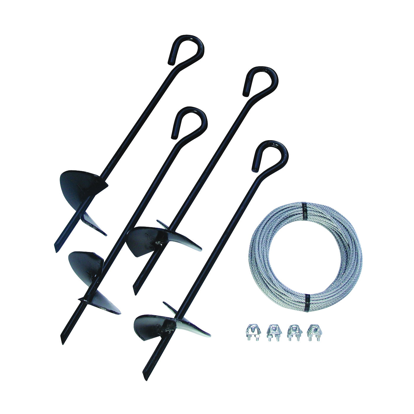 Provides do-it-yourself protection for most outdoor structures or possessions. Aids in the prevention of theft and high wind damage. May be used to anchor trees, fences, carports, antennas, boats, tents, airplanes, awnings and playground equipment. Includes four 15 in eye anchors with 4 in helix and 50 ft x 3/32 in stranded wire. Boxed.