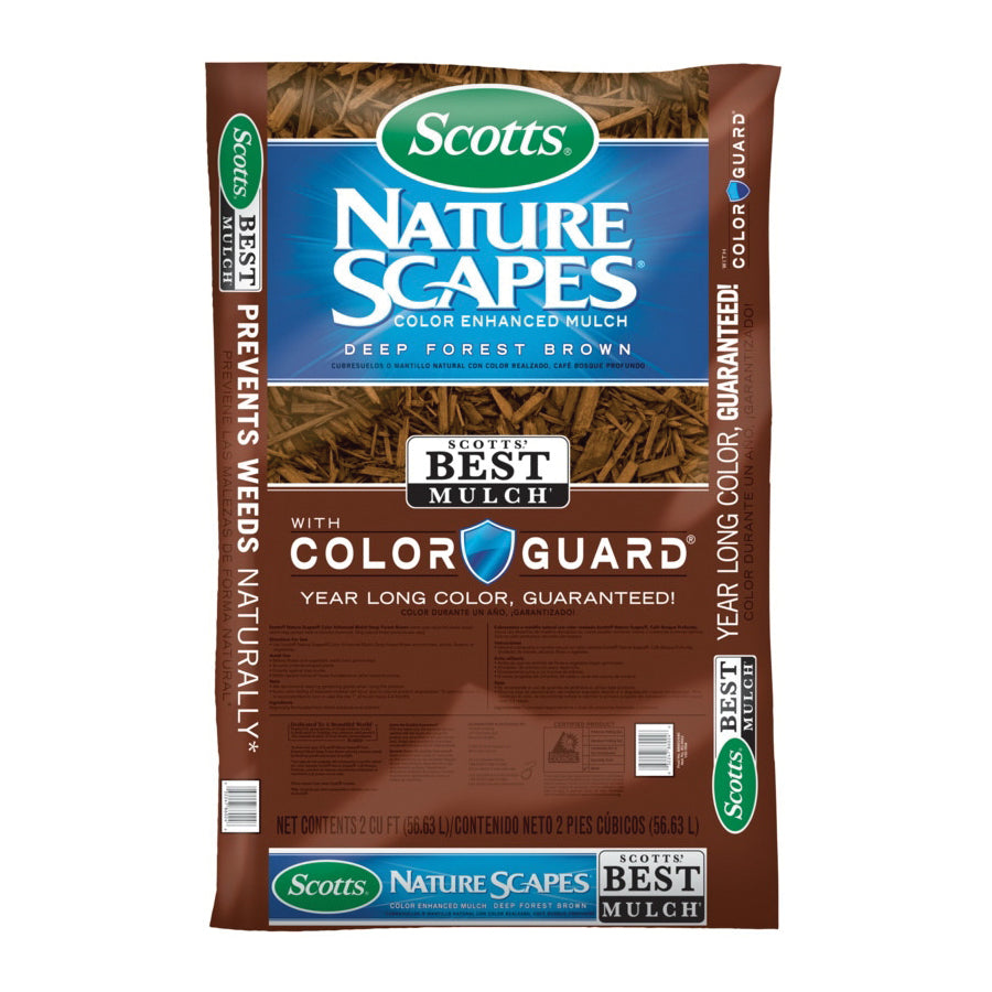 Locally made from regionally-based forest products, Scotts® Nature Scapes® Color Enhanced Mulch Classic Black brings vibrant, year-long color to your landscape. The ability to enjoy the bright colors all year comes from the Color Guard® technology which enables the mulch to retain its vibrant hues. An additional benefit is that just a three-inch layer of Scotts mulch naturally prevents weeds by leaving them no room to grow and blocking their access to sunlight. Place mulch around trees, shrubs, flowers, or vegetables. In addition to enhancing the natural beauty of your plants, the mulch helps to keep them hydrated by conserving the moisture in the soil. This mulch doesn't just look good, it is certified under Mulch & Soil Council for quality assurance and industry standards. Each bag contains only natural forest products, no construction debris or pallet wood is ever added. And every bag is manufactured an average of 150 miles from the store where it is sold. Keep mulch dry for 24 hours after application to experience the longest color and then, every 3-4 months, rake the top 1" of mulch to optimize its coloration.