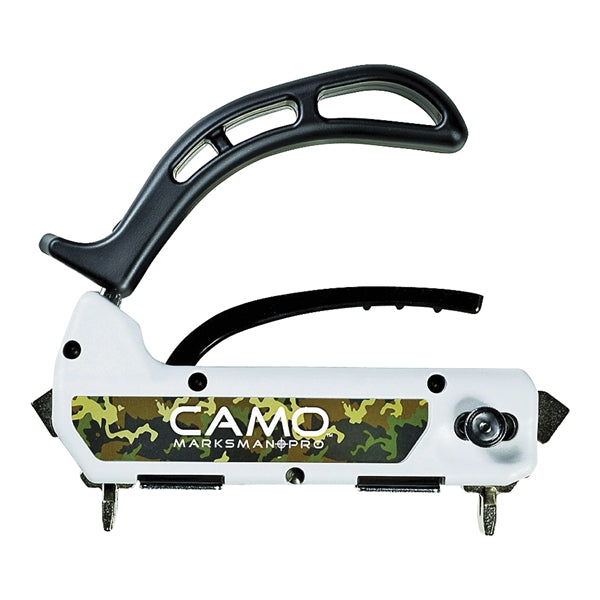 The Camo® Marksman Pro is a heavy-duty contractor-grade tool. The Marksman Pro positions Camo® deck screws to penetrate the deckboard. This tool easily adjusts to fit 5 1/4 in to 5 3/4 in deckboards and clamps securely to the deckboard. The Marksman Pro also provides automatic 3/16 in spacing between boards and has dual screw guides that enable both sides of the board to be fastened to the joist with single tool placement.