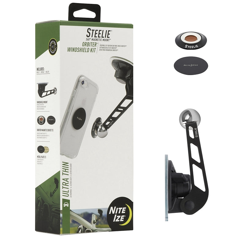 Nite Ize Orbiter Windshield Kit, Aluminum/Metal/Neodymium Magnet/Silicone, Black, Dimensions: 2.2 in L x 4.13 in W x 10.75 in H, Includes: Metal plate, Windshield mount, Orbiter magnetic socket