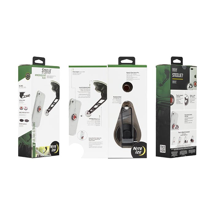 Safely communicate and navigate hands-free when you hit the road with the Steelie windshield mount kit plus. The magnetic phone socket plus features a powerful neodymium magnet and offers twice the holding power as our magnetic phone socket making it perfect for both standard and plus-sized devices, with or without a case. The Steelie magnetic phone socket contains a silicone center, creating a smooth glide and firm-grip when connected to the Steelie ball that allows you to easily rotate the phone from portrait to landscape. With two convenient ways to attach the magnetic phone socket plus to your device, you can decide whether to keep the phone-safe magnet on your phone all the time or use the MultiStick Adapter, which allows you to remove and re-stick the magnetic phone socket plus multiple times. The windshield mount features an adjustable aluminum arm and suspended Steelie ball design. The adjustable arm can be easily secured to an ideal angle, while the round shape of the Steelie ball allows for endless viewing angles of your phone. The patented suction cup design features an easy-to-use locking lever that engages the suction cup for ultimate holding power to your windshield.