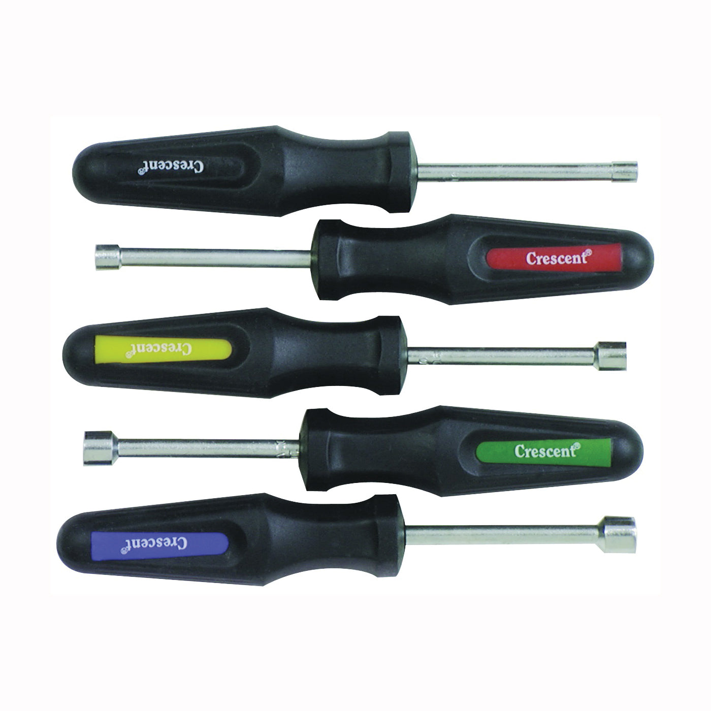 Solid steel shafts that are color-coded for easy identification. Ergonomic, high-efficiency, high-torque handle with cushioned rubber cover for slippage control. Includes 3/16 in, 1/4 in, 5/16 in, 11/32 in and 3/8 in nut drivers.